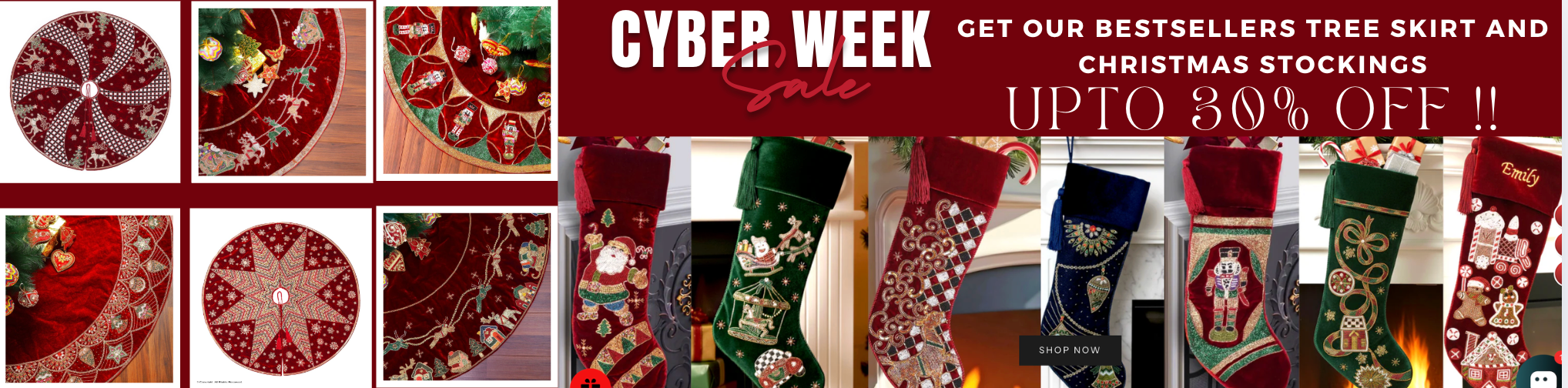 Decorate Your Christmas with our stunning collection of Christmas Skirts, Stockings, Ornaments, mantle scarfs, Pillows and many more