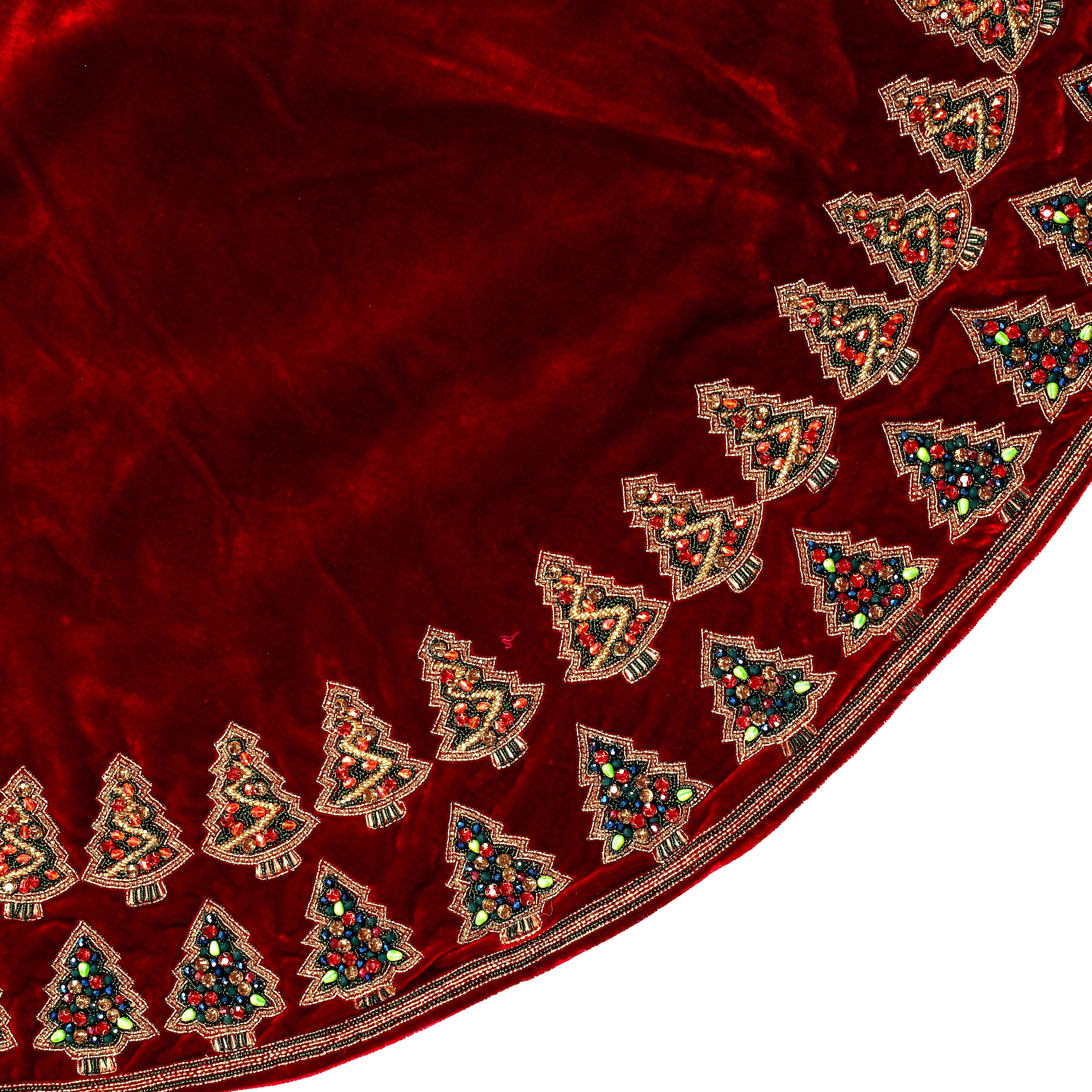 Imagine your Christmas tree standing proudly atop a forest of hand-beaded trees, each one shimmering with a dazzling array of gemstones. From the fiery reds to the shimmering green, this skirt is a feast for the eyes. It's like having a miniature jewel-encrusted forest at your feet, adding a touch of magic and sparkle to your holiday celebrations.